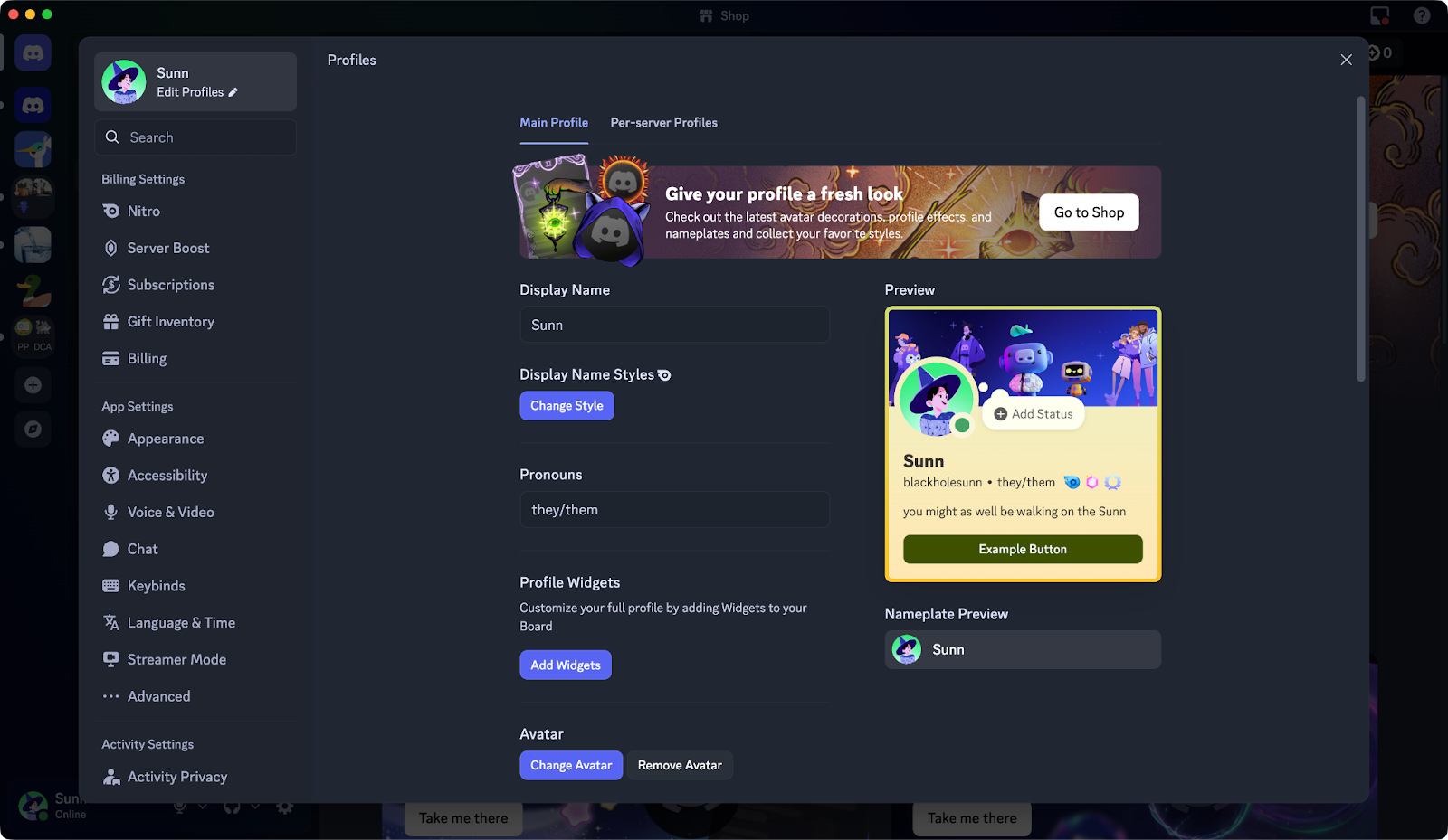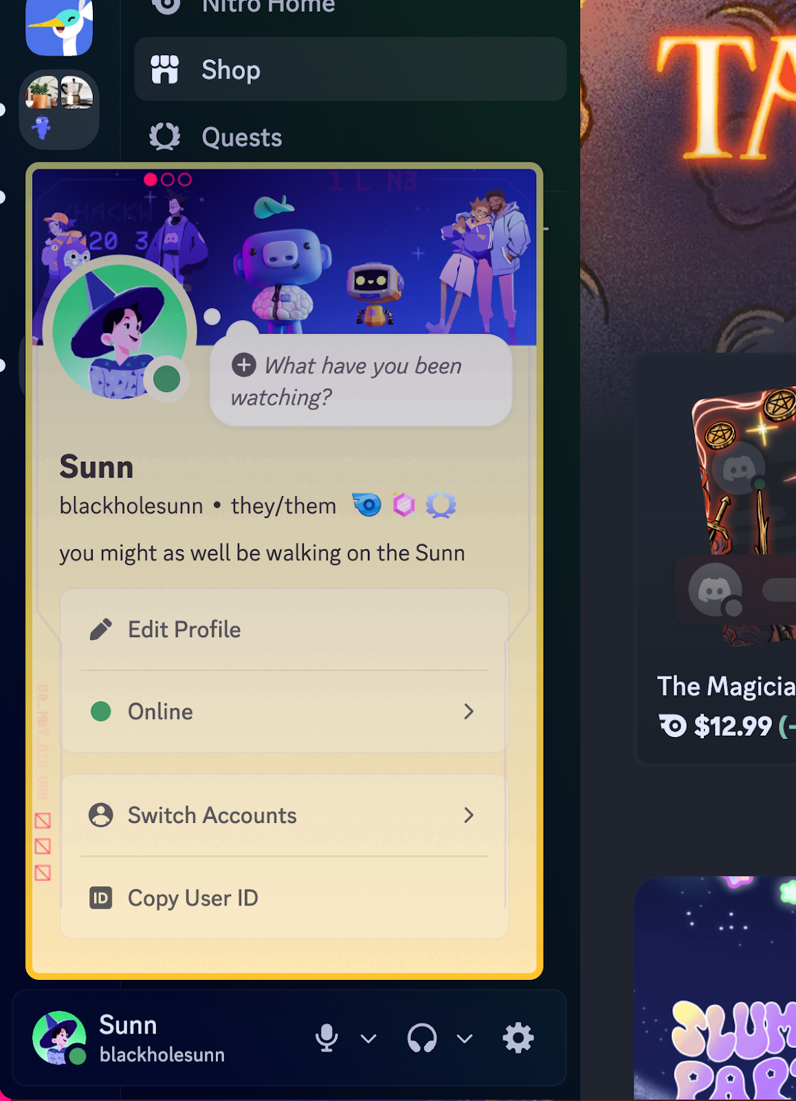 The Shop offers additional ways to customize how your profile looks on Discord. Some of the items available even extend beyond your profile, including on your avatar in chat or behind your display name when you’re listed in servers and Group DMs!